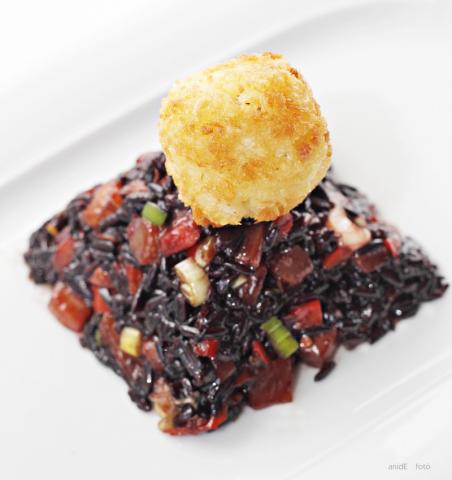 Töltsd a fekete rizs keveréket egy gúla formájú tálaló formába. Szúrj egy pálcikát egy sajtgolyóba és óvatosan ültesd a piramis hegyére. (Nekem sikerült)