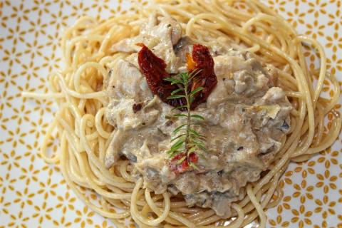 Hazaérve áldjuk az eszünk, hogy a kamrában akad egy-két konzerv. A szemünk megakad egy articsóka konzerven. Reggelről maradt még két paradicsom és hosszas kutakodás után találunk egy kis szárított gombát is a polcon. Tészta mindig van otthon és ezzel már sínen is vagyunk...