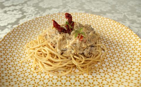 Szedj a tányérra egy adag spagettit, készíts egy kis fészket a szósznak, amit ide merjél. Ha gondolod, megszórhatod egy kevés frissen reszelt parmezán sajttal is, de igazán nem fontos. Ízlésed szerint díszítheted félretett zöldfűszer ágacskával és paradicsommal (esetleg szárított paradicsommal).