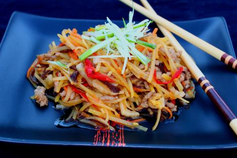 Bármennyire is tésztát vélsz felfedezni az ételben úgy első ránézésre, a spagettifélének látszó valamiknek a külsőt leszámítva nem sok közük van a tésztához. Elsőre furcsán hat a válasz: az, ami tésztának látszik benne, az krumpli. Wokban pirított krumplicsíkok.