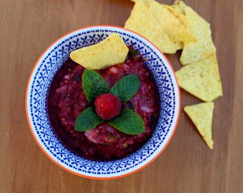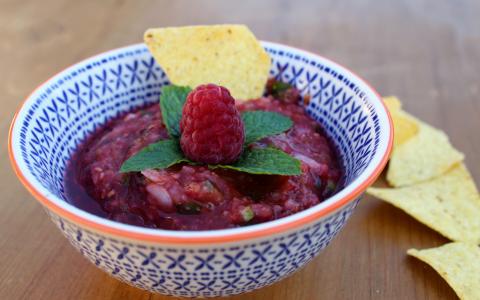 A kihűtött salsát szedd tálkába, díszítsd mentával és a félretett málnaszemmel. Tortilla chipset kínálj hozzá.