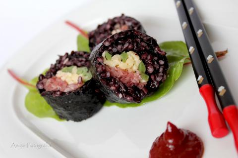 Ezt az ételt egy receptverseny egyik fordulójára készítettem. Az előző fordulók alapanyagai nem ihlettek semmi különlegességre, pedig ha valamin gondolkodom és nem csak egy szimpla vacsorának szánom a család asztalára, akkor a célom, hogy különleges legyen. Ebben a fordulóban a meghatározott öt kötelező alapanyag (rizs, sonka, sajt, ketchup és olivaolaj) kombinációja sem kínálta tálcán a különlegességet és ráadásul nem is könnyű egyedien párosítani őket. Nézegetve az alapanyagok listáját, egy sushi képe ugrott be először. Utána már csak azon kellett gondolkodnom: na jó, de ilyen sushi nincs... Hogyan alkossam meg, hogy legyen? Sanyi (a Miele Főzőiskola szakácsa) mondta egyszer, hogy én fabrikálok olyan ételeket, amilyen ételek nincsenek is. Akkor sem tudtam hirtelen eldönteni, hogy ezt dícséretnek vagy szidásnak vegyem, talán mindkettő pozitív esetben. Merőben szokatlan dolog és talán tiszteletlenség is egyben az általam nagyra becsült tradícionális sushi készítés technológiáját és koncepcióját ennyire kicsavarni, ezért is hívom sushi imitációnak. De higyjétek el. a recept működik a valóságban, mert finom és ráadásul igen látványos is. Szokatlan? Az. Sushinak mindenképpen, hiszen se hal, se zöldség és még a rizs is az általam favorizált thai fekete rizs, a jól bevált sushi rizs helyett. Az alapanyagait tekintve felcimkézhetem "Super Food" jelzővel. A Thai fekete rizs, a cranberry és a paradicsom egy ételben felér egy egész doboz multivitamin tablettával, antibakteriális és rákmegelőző kúrának egy adagjával.